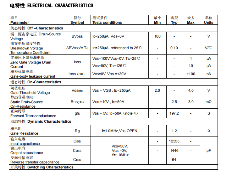 在其特性中具備低導通內阻、低柵極電荷、100% EAS測試、100% DVDS熱阻測試、100% Rg測試、VTH細化分檔、SGT工藝、